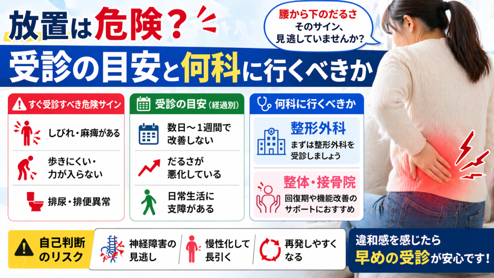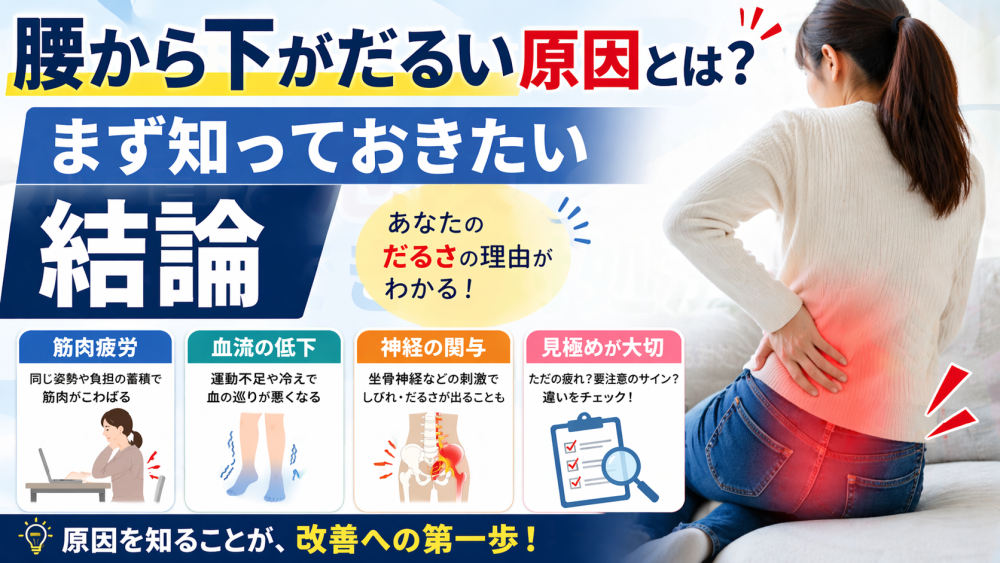 腰から下がだるい原因は筋肉疲労だけでなく、神経や血流の問題が関係していることもあります。本記事では、だるさの原因の見分け方・今すぐできる対処法・放置してはいけない危険サイン・受診の目安までわかりやすく解説します。