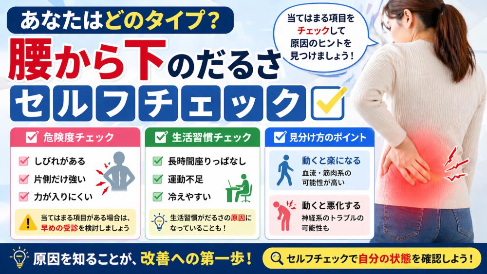 つまり、腰から下のだるさは「疲れているサイン」として現れていることもあります。ただし、すべてがそれだけとは限らないため、次のチェックもあわせて意識していくことが重要です。