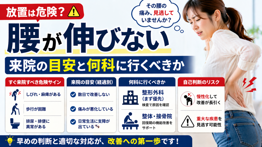 腰が伸びない原因は筋肉の硬さだけでなく、神経や関節の問題が関係している場合もあります。本記事では腰が伸びない理由、今すぐできる対処法、やってはいけないNG行動、受診の目安までわかりやすく解説します。