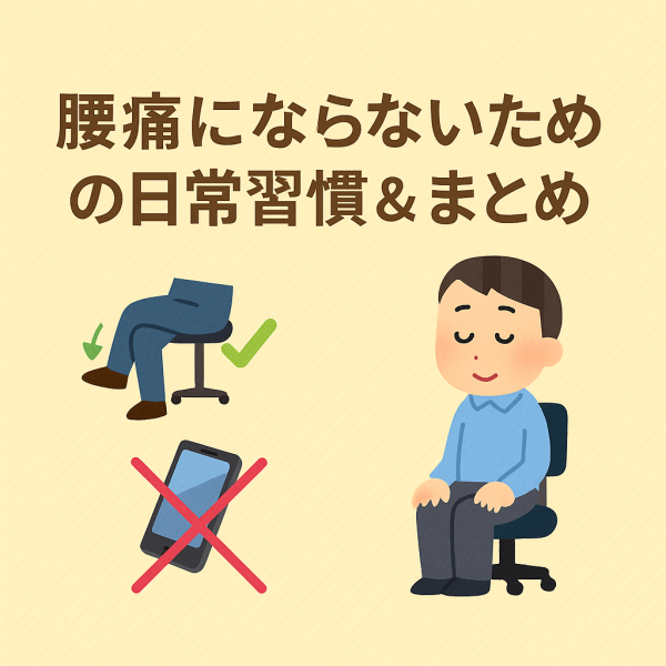 「1時間に1回は立ち上がる」「スマホは目線の高さに上げる」など、小さな意識づけを日常に取り入れることが、腰を守る第一歩になります。