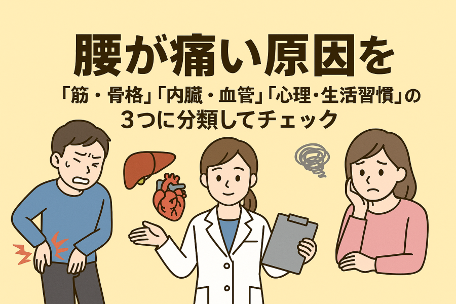 腰が痛い原因を「筋・骨格」「内臓・血管」「心理・生活習慣」の3つに分類してチェック