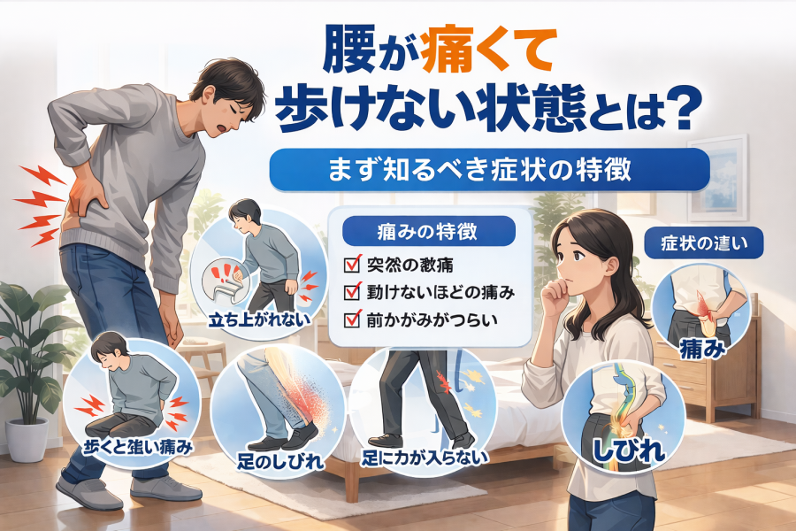 腰が痛くて歩けない時の原因(ぎっくり腰・椎間板ヘルニア・脊柱管狭窄など)をわかりやすく解説。応急対応・セルフケア・受診の目安までまとめ、日常生活でどう対処すべきかを丁寧にお伝えします。