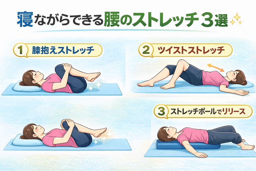 腰のストレッチ を寝ながら・座ったままなどの日常生活でもできる方法でわかりやすく解説。腰痛改善・血行促進・腰の張りを緩和するストレッチ10選+実践のコツ・注意点まで完全ガイド。