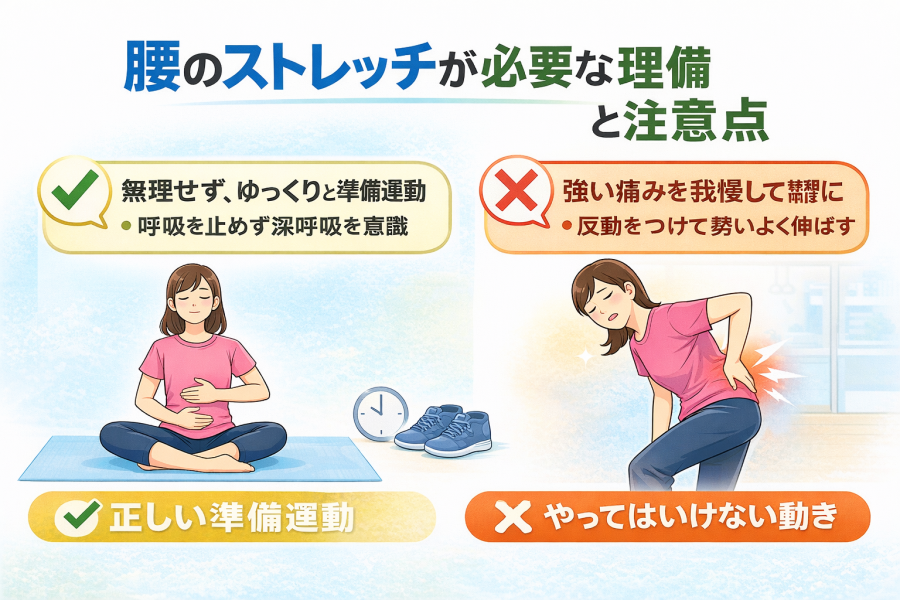 ②腰のストレッチを始める前の準備と注意点(検索意図:安全性)