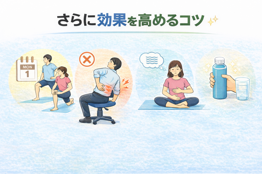 また、腰だけでなく**お尻や太ももの裏(ハムストリングス)**も意識したストレッチが役立つ場合があると言われています。これらの筋肉は骨盤と関係が深く、硬くなると腰に負担がかかりやすいと考えられています。