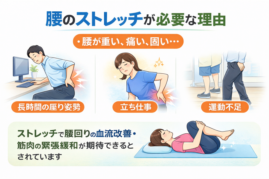 腰のストレッチが注目される理由は、特別なケガがなくても腰に違和感や重だるさを感じる人が多いからだと言われています。デスクワークで長時間座りっぱなしだったり、立ち仕事が続いたり、運動する時間が取れなかったり。こうした生活が続くと、腰まわりの筋肉が動かされない状態になり、緊張しやすくなる傾向があるようです。