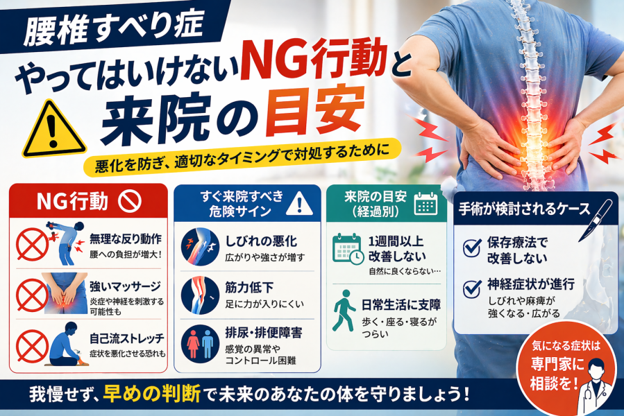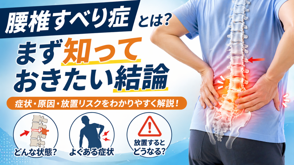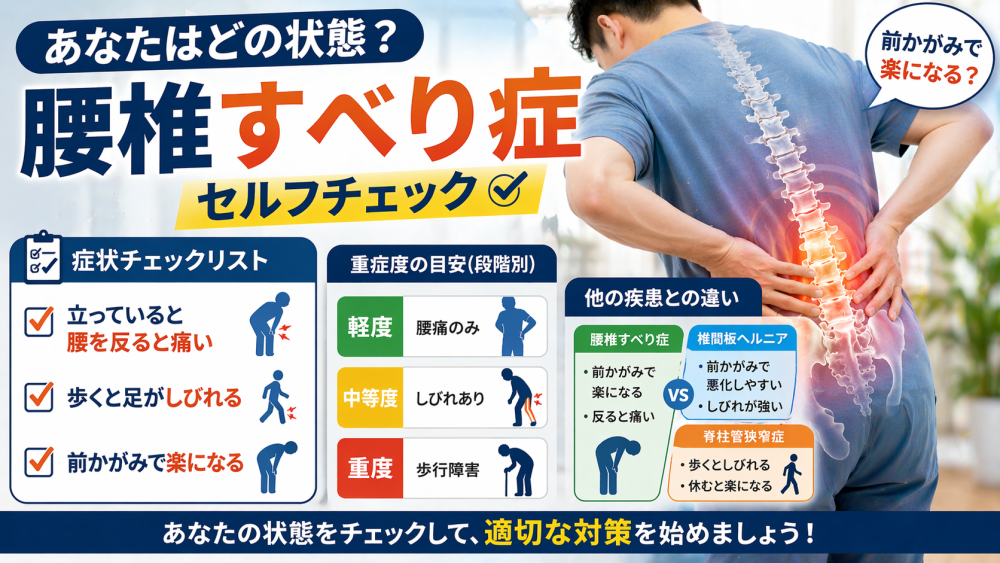 腰椎すべり症の原因・症状・進行リスクを分かりやすく解説。セルフチェックで状態を確認し、ストレッチや日常対策、やってはいけないNG行動、受診や手術の目安まで専門的にまとめています。