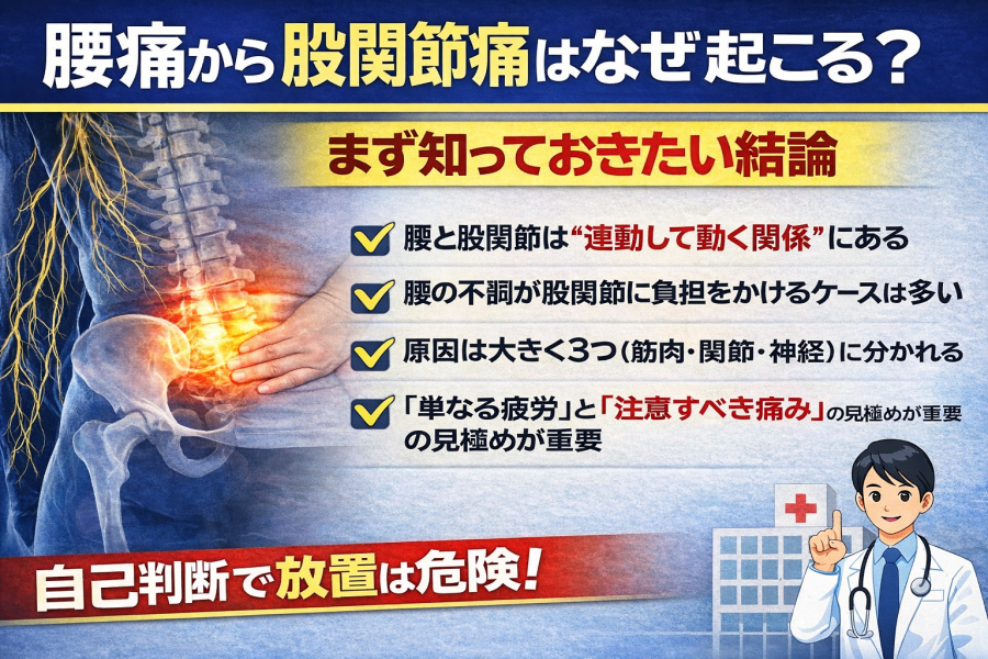 腰痛から股関節痛が出るのはなぜ?筋肉の連動・神経の影響など原因の違いをわかりやすく解説。見分け方・セルフチェック・今すぐできる対処法から危険サイン、受診の目安まで専門的に解説します。