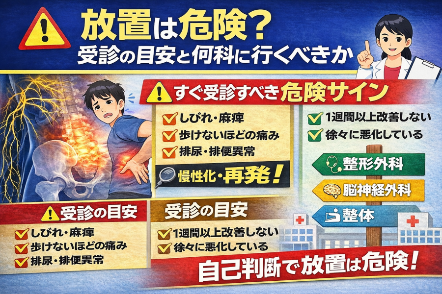 ここまでチェックして「なんとなく当てはまるかも」と思った方もいるかもしれません。ただし、次のような症状がある場合は少し慎重に考えたほうがよいと言われています。たとえば、安静にしていても痛みが続く、夜間に強くなる、徐々に悪化しているといったケースです。また、「力が入りづらい」「踏ん張れない」といった感覚がある場合も見逃せません。このようなサインがあるときは、無理に我慢せず状態を確認することが重要です。