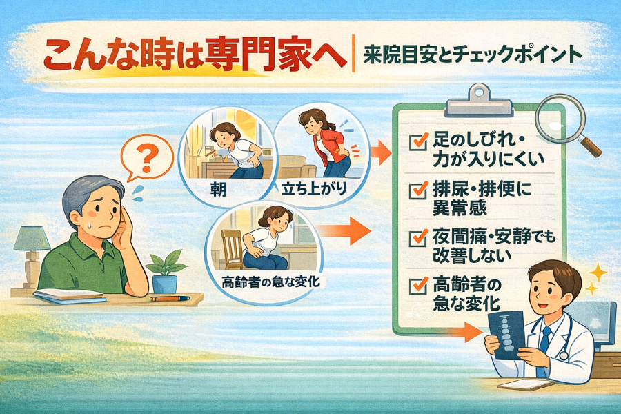 このような夜間痛や、安静にしても腰痛が改善しにくい状態が続く場合も、来院の目安になるとされています。時間の経過だけで様子を見るより、一度体の状態を確認する考え方が紹介されています。