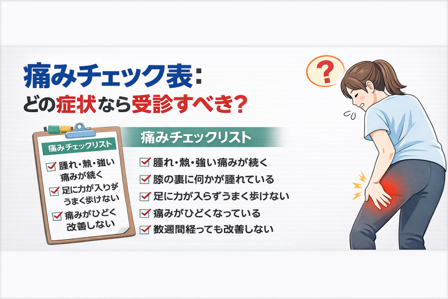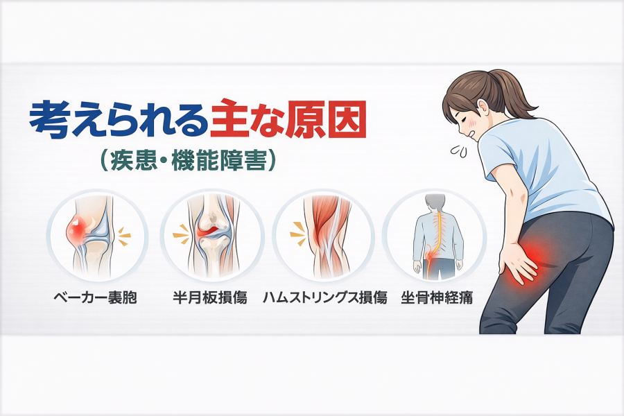 ChatGPT Image 2026年1月14日 22_26_11「歩き出した瞬間だけ膝の裏がズキッとする」「歩いているとだんだん違和感が強くなる」「触ると膝の裏が少し腫れている気がする」——こんな経験、ありませんか?