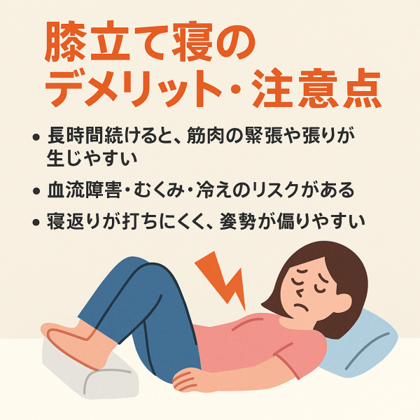 膝を立てる姿勢を長く続けると、下肢の血流が一部制限され、むくみや冷えにつながることがあると言われています。特に血流が滞りやすい人では、夜中に足がだるくなったり、つりやすくなるケースもあるようです。血流が気になる人は、就寝中に同じ姿勢を固定せず、寝返りや足を伸ばす動きを取り入れることがすすめられています。引用元:にっこり鍼灸整骨院
