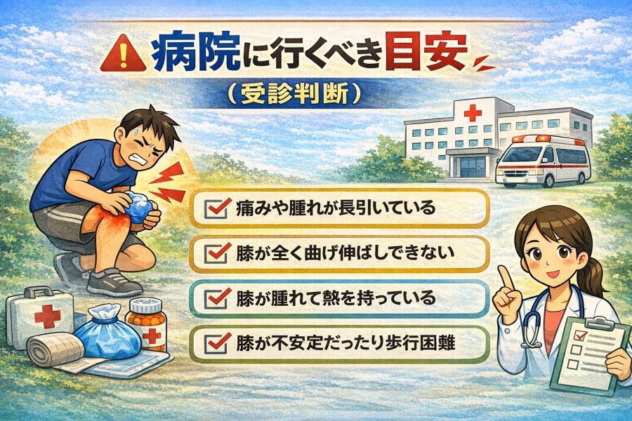 膝の痛みが出たとき、多くの人がここで迷います。軽い違和感であれば経過を見る選択もありますが、症状によっては早めの来院が大切になるケースもあると言われています。ここでは、判断の目安を整理します。
