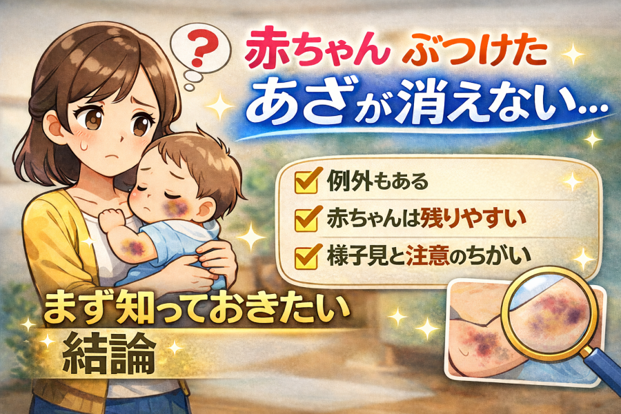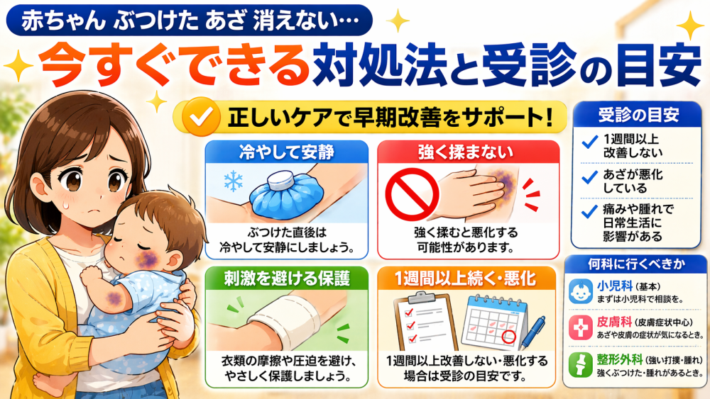 赤ちゃん ぶつけた あざ 消えないと不安な方へ。消えない原因や治るまでの期間、危険なあざの特徴、今すぐできる対処法、受診すべき目安まで分かりやすく解説します。