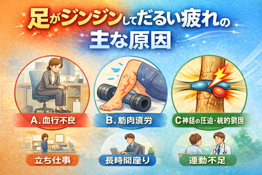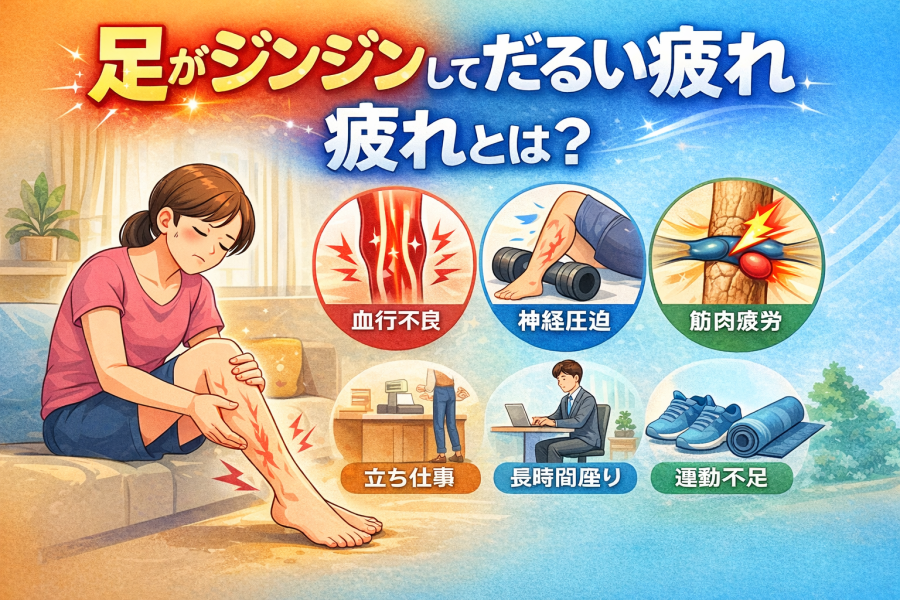 足がジンジンしてだるい 疲れで悩んでいませんか?血行不良・筋疲労・神経圧迫などの原因から、今すぐできる対策(ストレッチ・マッサージ・生活習慣の見直し)まで分かりやすく解説します。医療機関受診の目安も紹介。