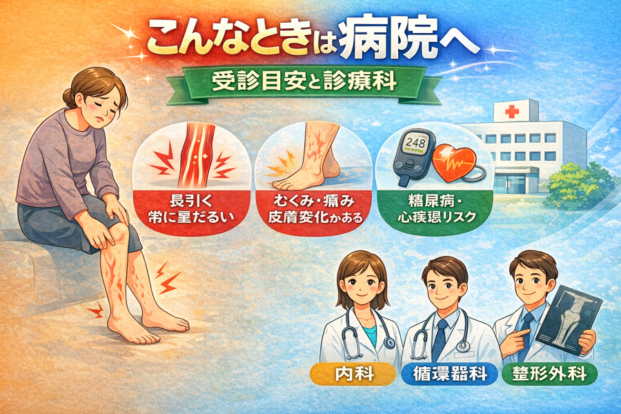 血流や循環が気になる場合は循環器科、姿勢や筋肉・関節の負担が関係していそうなときは整形外科が選択肢になることもあるようです。