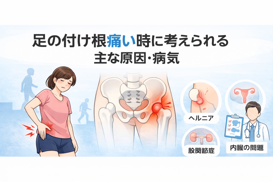たとえば、鼠径ヘルニア(脱腸)や大腿ヘルニアでは、足の付け根周辺に違和感や痛みが出るケースがあると言われています。