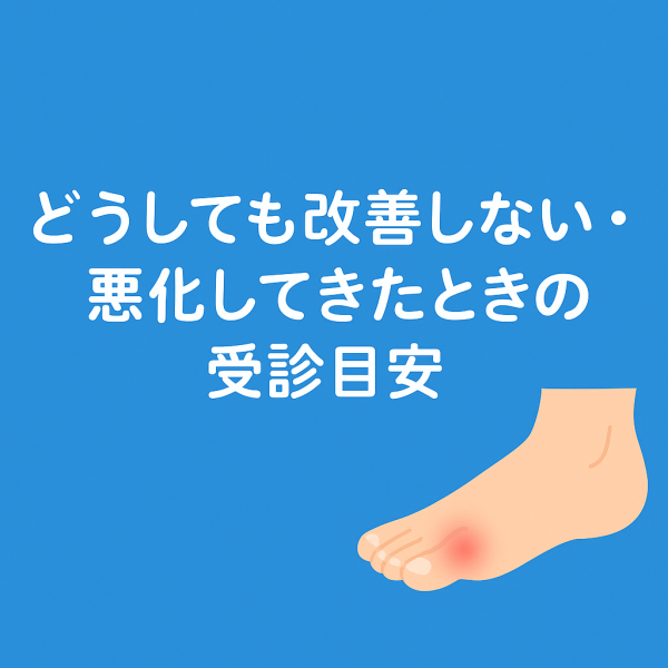 「数日経っても足の指の付け根の痛みが引かない」「だんだん腫れてきた」「歩くのがつらい」──そんなときは、早めに専門家へ相談することがすすめられています。