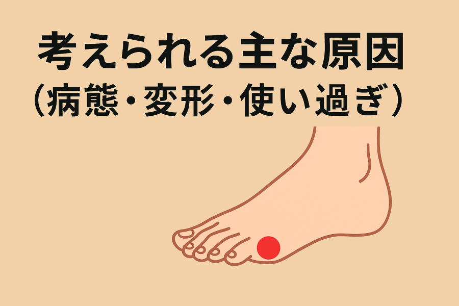 足の横アーチが低下し、体重が均等に分散されず、特定の中足骨に過度な荷重がかかることで炎症や疲労が生じます。