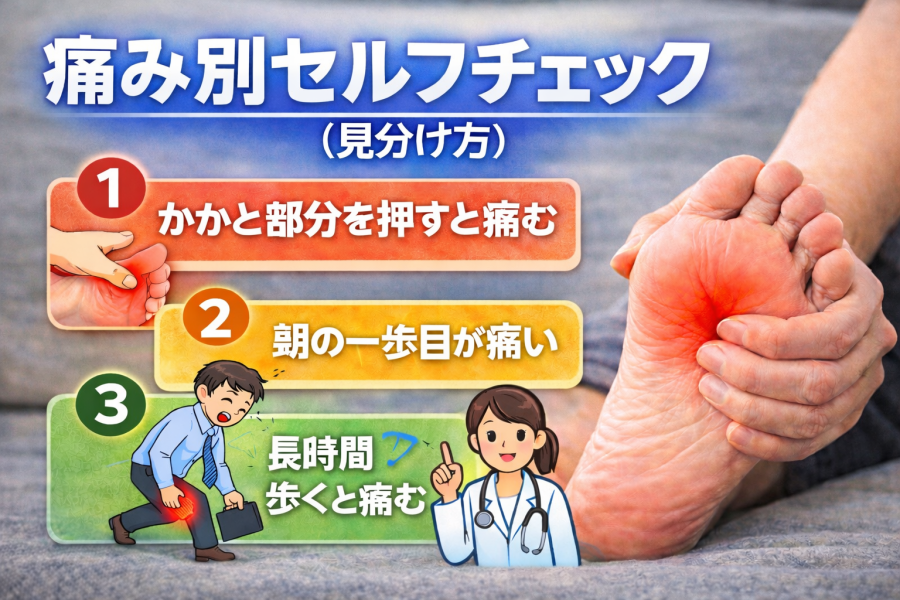 そんなときは、痛む場所やタイミングに注目してみると、ある程度の見当がつくと言われています。ここでは、特に多く見られる足底腱膜炎の特徴を中心に、セルフチェックの考え方を整理します。
