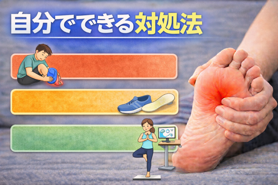 そう感じる方は多いと思います。足裏の痛みは、日常の過ごし方やセルフケアを見直すことで、負担を減らせる場合があると言われています。ここでは、無理なく取り入れやすい対処法を症状別に整理します。