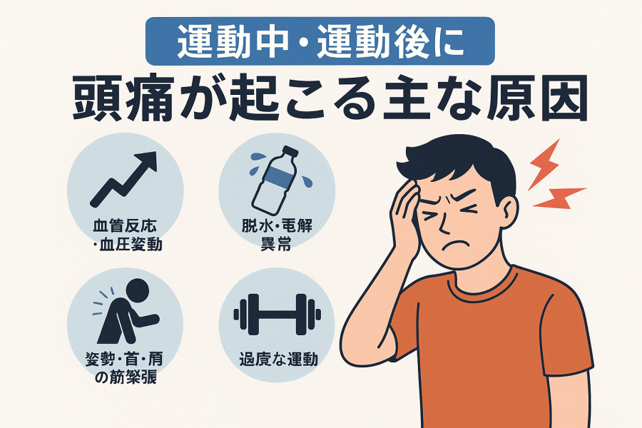 ChatGPT Image 2025年10月21日 13_32_22「運動すると頭痛が出るのはなぜ?」と思ったことはありませんか?実はその背景には、血流や姿勢、体内バランスなど、いくつかのメカニズムが関係していると言われています。ここでは、運動中・運動後に頭痛が起こる主な原因をわかりやすく整理していきましょう。