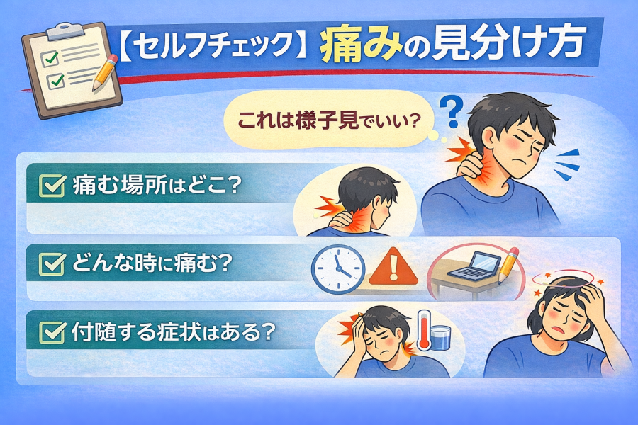「なんとなく痛い」で終わらせず、痛みのタイプを知ることが、次の対策につながる第一歩になるはずです。