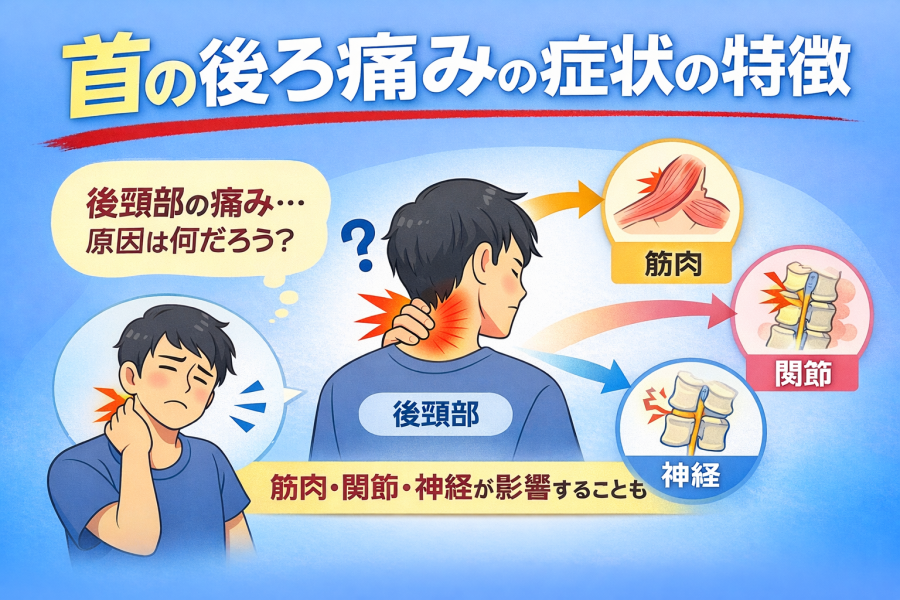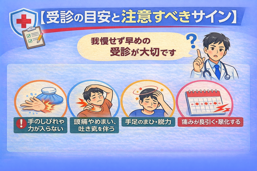 「首の後ろ痛み=全部同じ」と考えず、いつもと違う強い症状がある場合は、早めに来院を検討する判断材料のひとつになるようです。