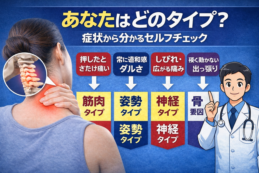 「首の後ろ 骨 出っ張り 押すと痛いって、自分はどのパターンなんだろう?」と迷いますよね。ここはかなり大事なポイントで、原因によって対処の考え方が変わると言われています。なんとなくケアするより、「自分のタイプ」を把握しておくほうが遠回りしにくいです。難しく考えなくて大丈夫なので、今の状態に一番近いものをチェックしてみてください。