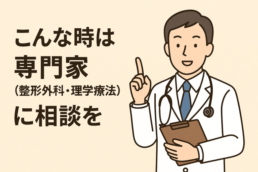 特に、安静時でも痛みが続く/階段の上り下りやしゃがみ動作がつらい/1〜2週間セルフケアを続けても変化がないという状態なら、早めに専門家へ相談するのがおすすめです。