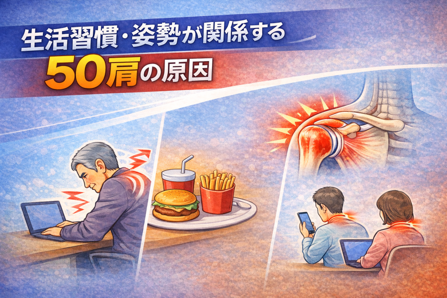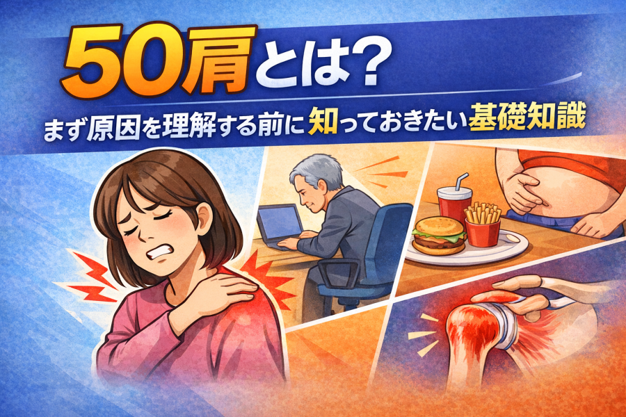 50肩 原因は加齢だけではありません。肩関節の変化、血流低下、姿勢や生活習慣との関係をわかりやすく解説し、痛みが出る仕組みと予防・対処の考え方まで紹介します。