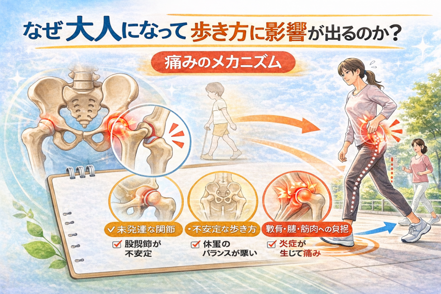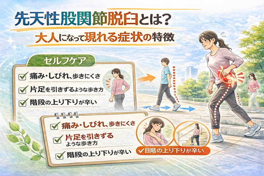 先天性股関節脱臼 大人 歩き方 に悩む方へ。大人になって現れやすい歩き方の特徴(トレンデレンブルグ歩行)、痛みの理由、日常でできる改善ポイントをわかりやすく解説します。